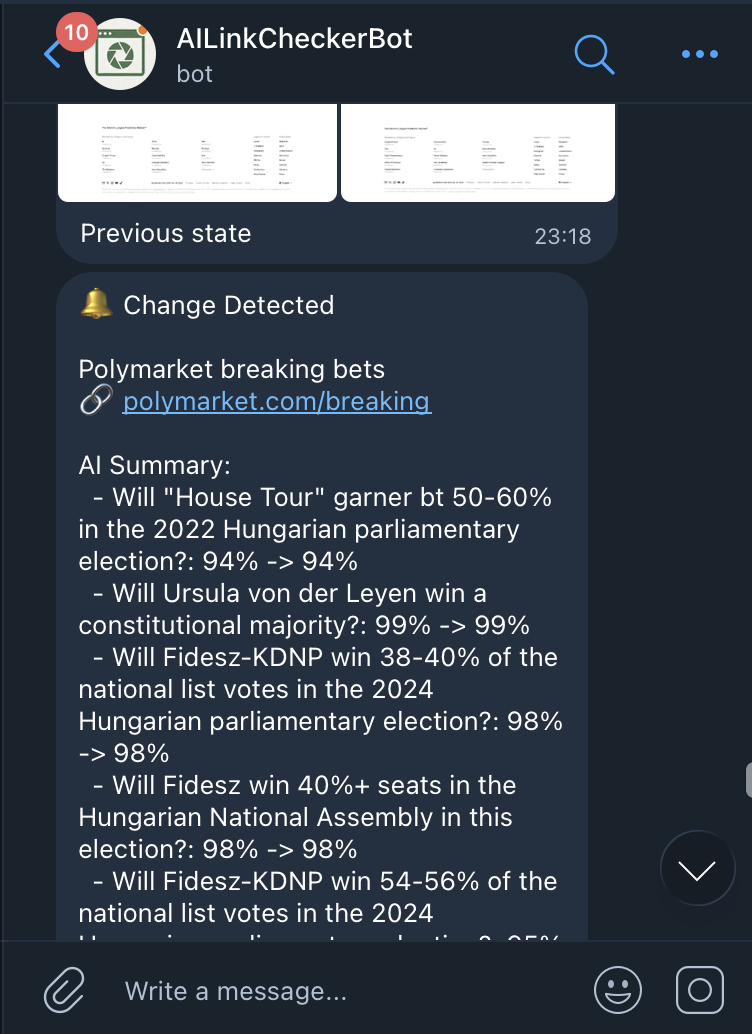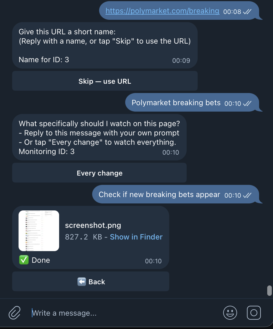 Send any URL to the bot in Telegram. It takes an initial screenshot and starts tracking.